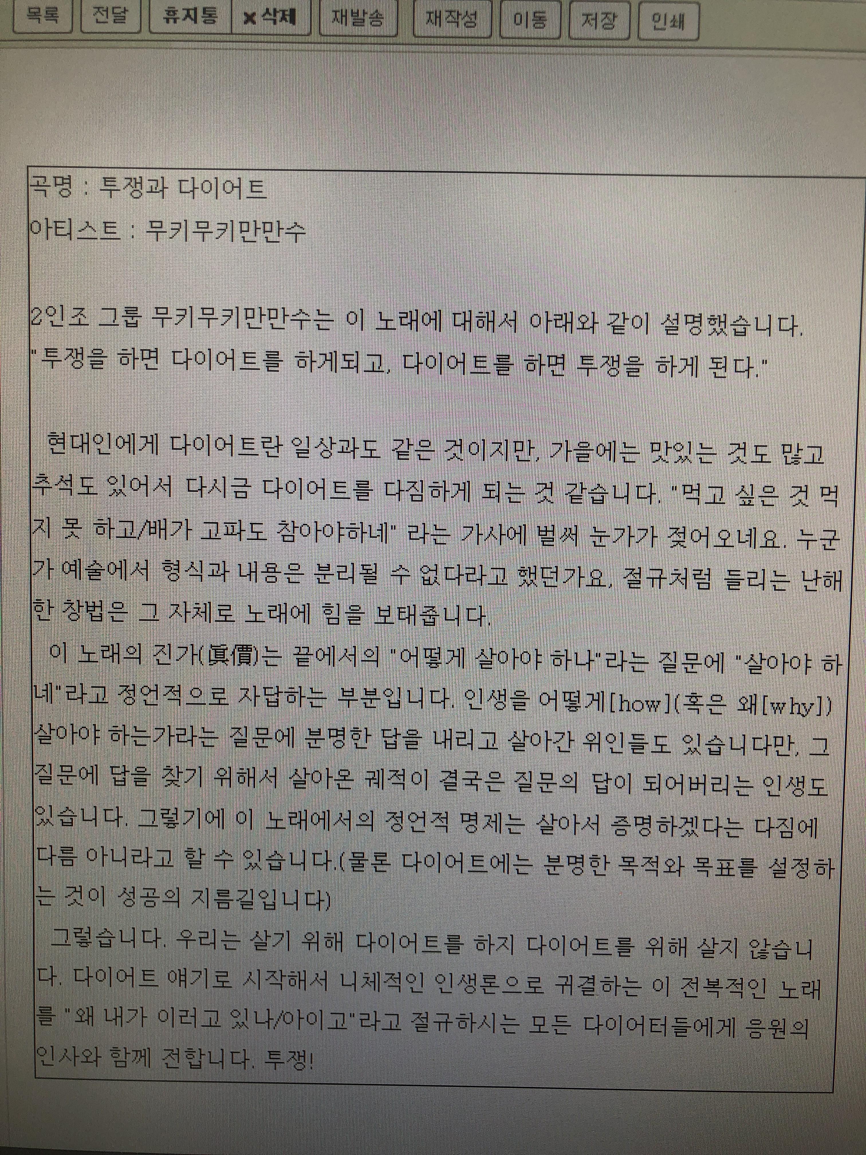 그렇습니다. 우리는 살기 위해 다이어트를 하지 다이어트를 위해 살지 않습니다. 다이어트 얘기로 시작해서 니체적인 인생론으로 귀결하는 이 전복적인 노래를 "왜 내가 이러고 있나/아이고"라고 절규하시는 모든 다이어터들에게 응원의 인사와 함께 전합니다.